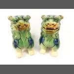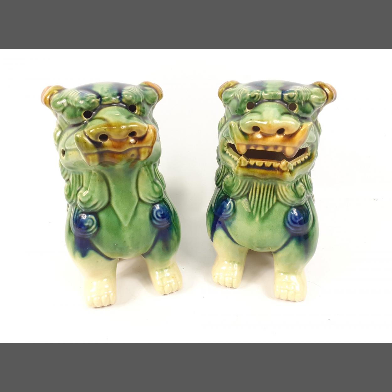 A pair of attractive decorative jade green coloured glazed ceramic FOO DOGS in lovely condition with no chips or repairs. Possibly incense burners as the nostrils and eyes have openings Each stands 22cm high approx. One with mouth closed and one with mouth open. A super little ornamental pair.