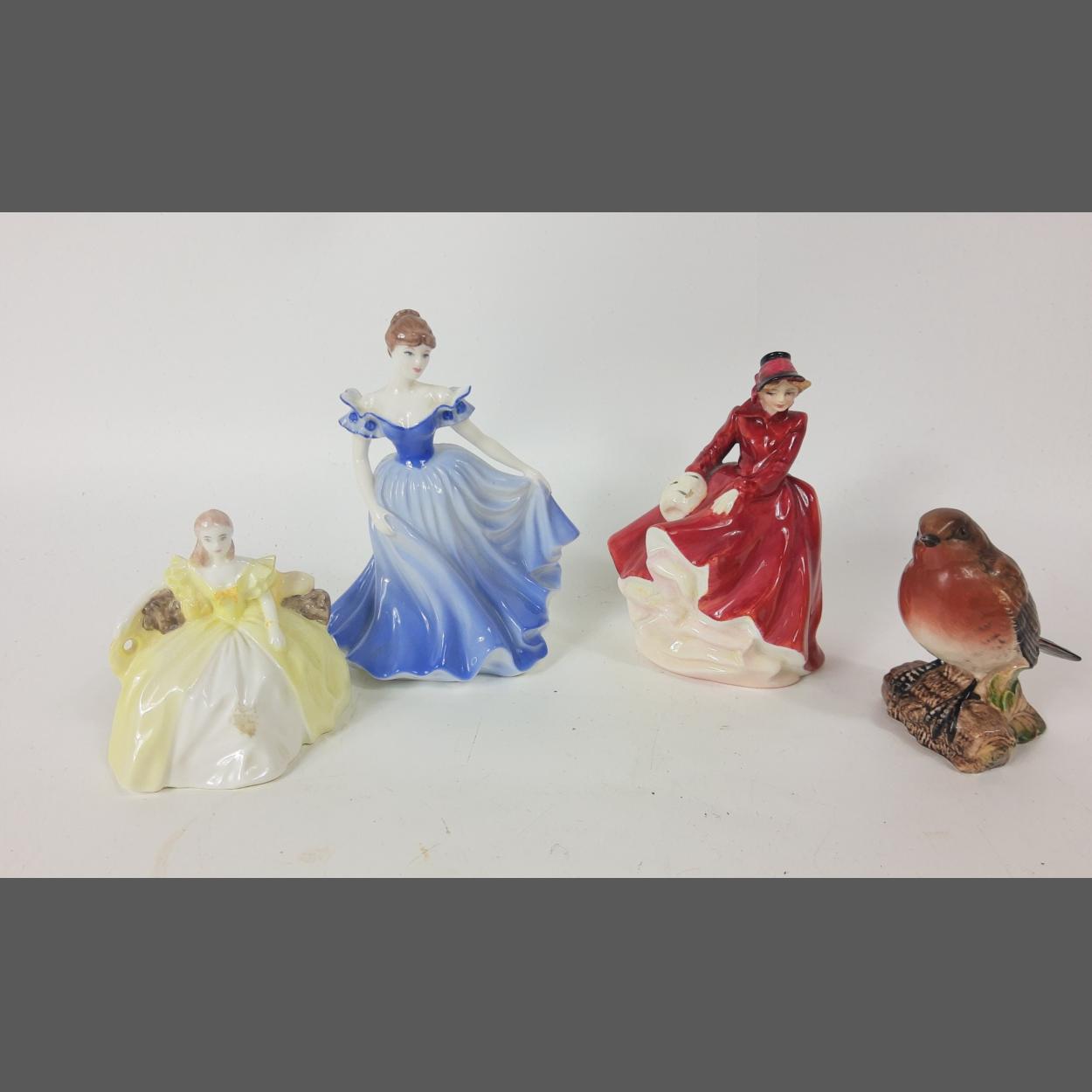 Two small COALPORT figurines - from the Debutante series 'Sandra' 13cm tall and from the Minuettes series 'Sophie' 7cm tall, plus Emma by ROYAL DOULTON 12cm tall (HN 3208), and a BESWICK robin (980) standing approx 8cm tall, no visible damage
