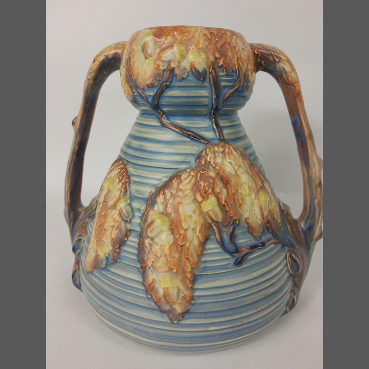 A large Art Deco Carlton Ware twin handled vase in the 'Blue Night Oak' pattern, stands 21cm high