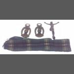 Two VINTAGE Robert Burns pendants on tartan ribbons 4x2.5cm and a white metal Christ on the cross pendant 5.5x4.5cm