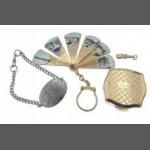 A small box to include a STRATTON yellow metal pill box, a tourist-style fan key-ring, a white metal oval inscribed trinket and a small old watch chain catch stamped 9 ct