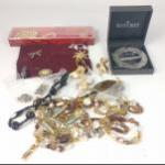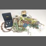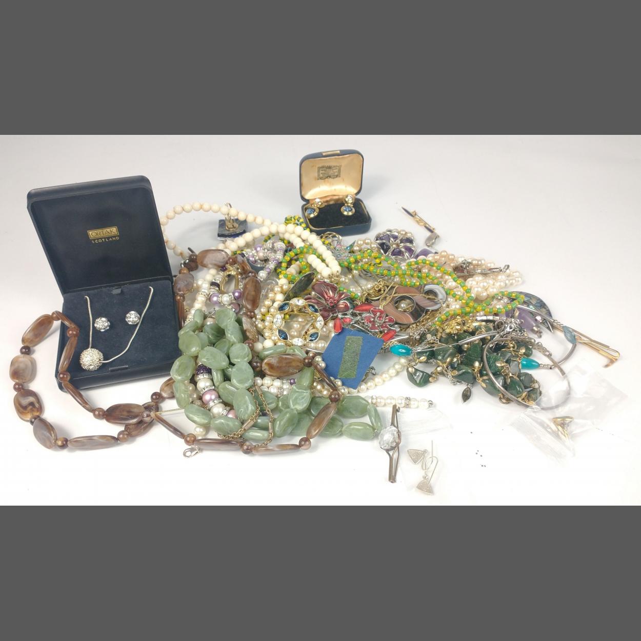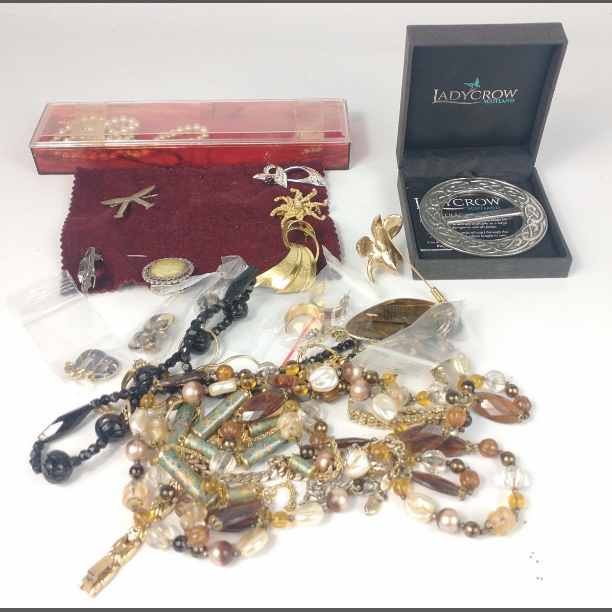 A bag of costume jewellery to include assorted brooches, strings of beads, rings and a Ladycrow pewter scarf ring