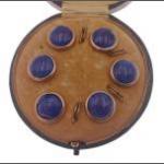 A boxed set of six EDWARDIAN yellow metal blue agate shirt studs (2 fasteners missing and 1 stud damaged)