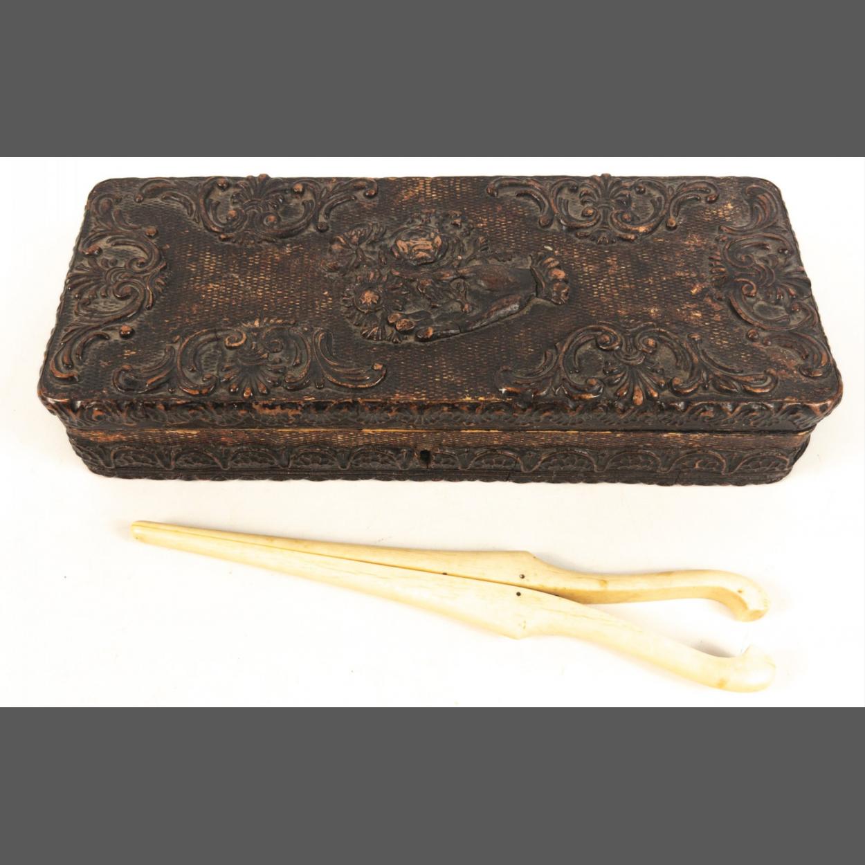 A nicely carved wooden box containing a pair of bone glove stretchers, box measures 26x10.5x5.5cm
