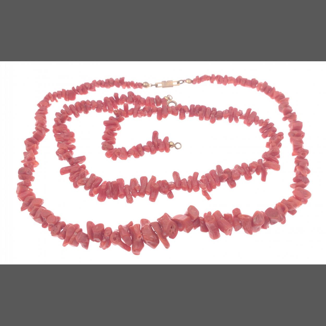 Two coral necklaces, the first being 40cm long with 9ct clasp, the second approx 42cm with yellow metal fastener