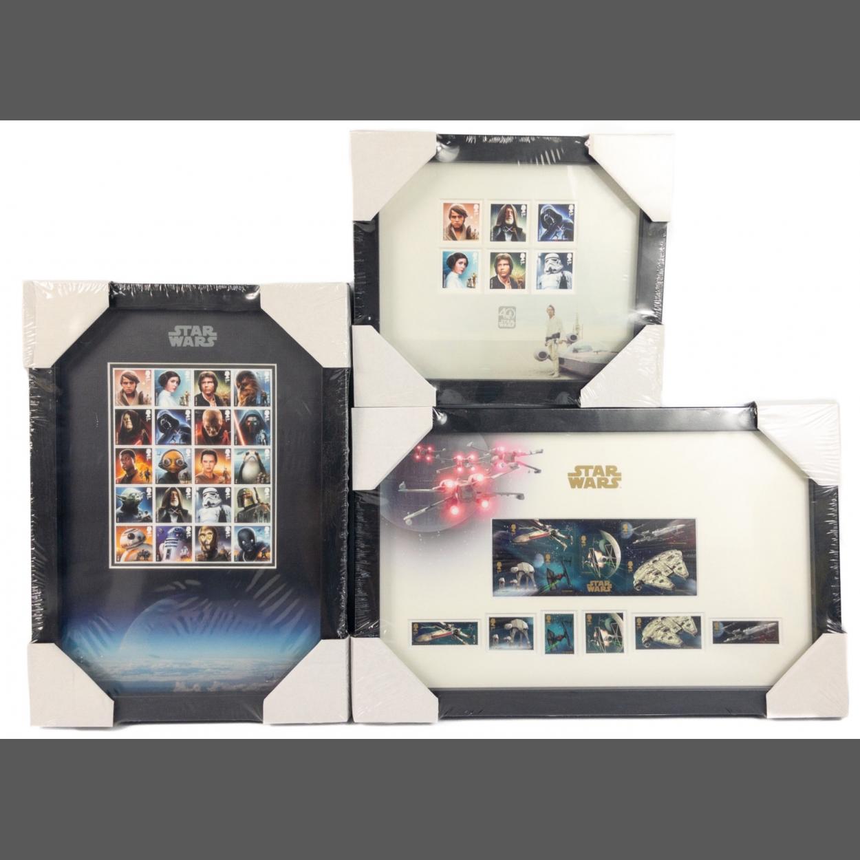 COLLECTIBLE ROYAL MAIL - a framed set of 24 STAR WARS characters first class stamps, frame size 38x27cm, a set of 6 framed first class stamps celebrating the 40th anniversary of the original Star Wars, frame size 27x23cm, and a set of Star Wars vehicles frame size 43x27cm