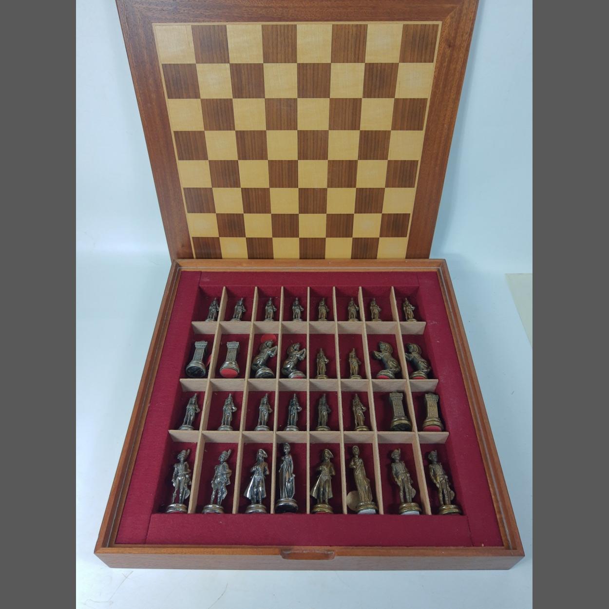 A boxed chess set with metal pieces all contained in a decorative wooden case with sliding chess board lid