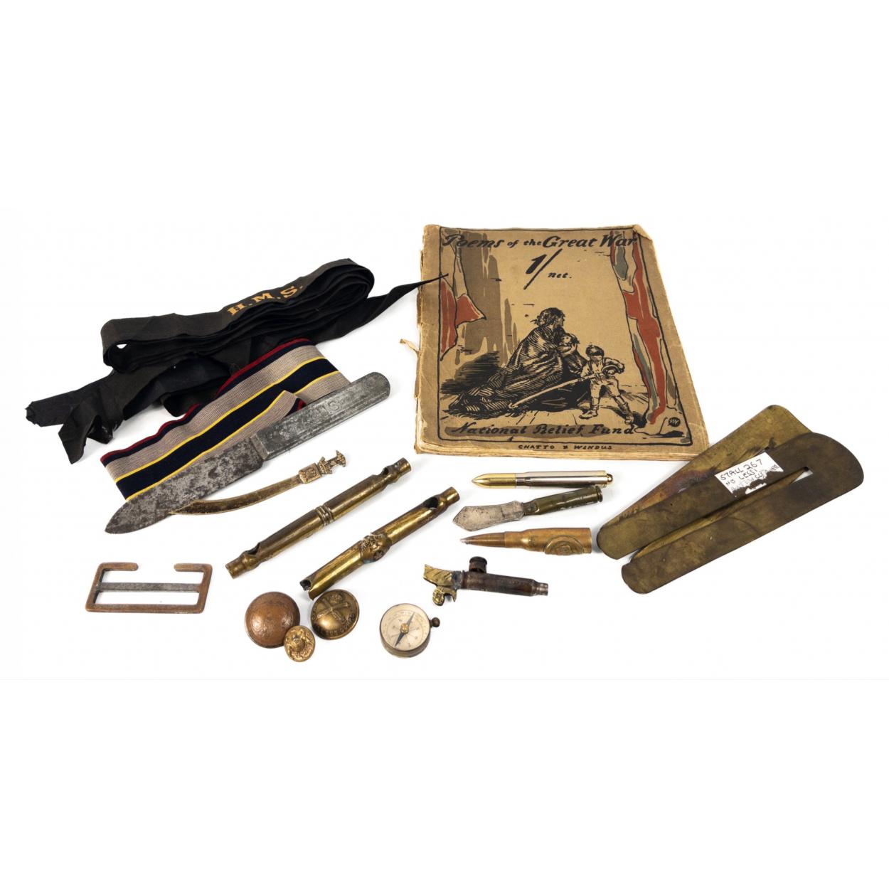 Intriguing lot of World War 1 WWI Trench art and other items to include: a 1917 dated US Patented mass knife, a Machine Corps uniform button, pencil holder mini compass, a trench pipe, paper knife, a bullet lighter, two button cleaning bars, three Royal Navy H.M.S. cap tallys and an arm band. Also includes a copy of National Relief Funds POEMS OF THE GREAT WAR