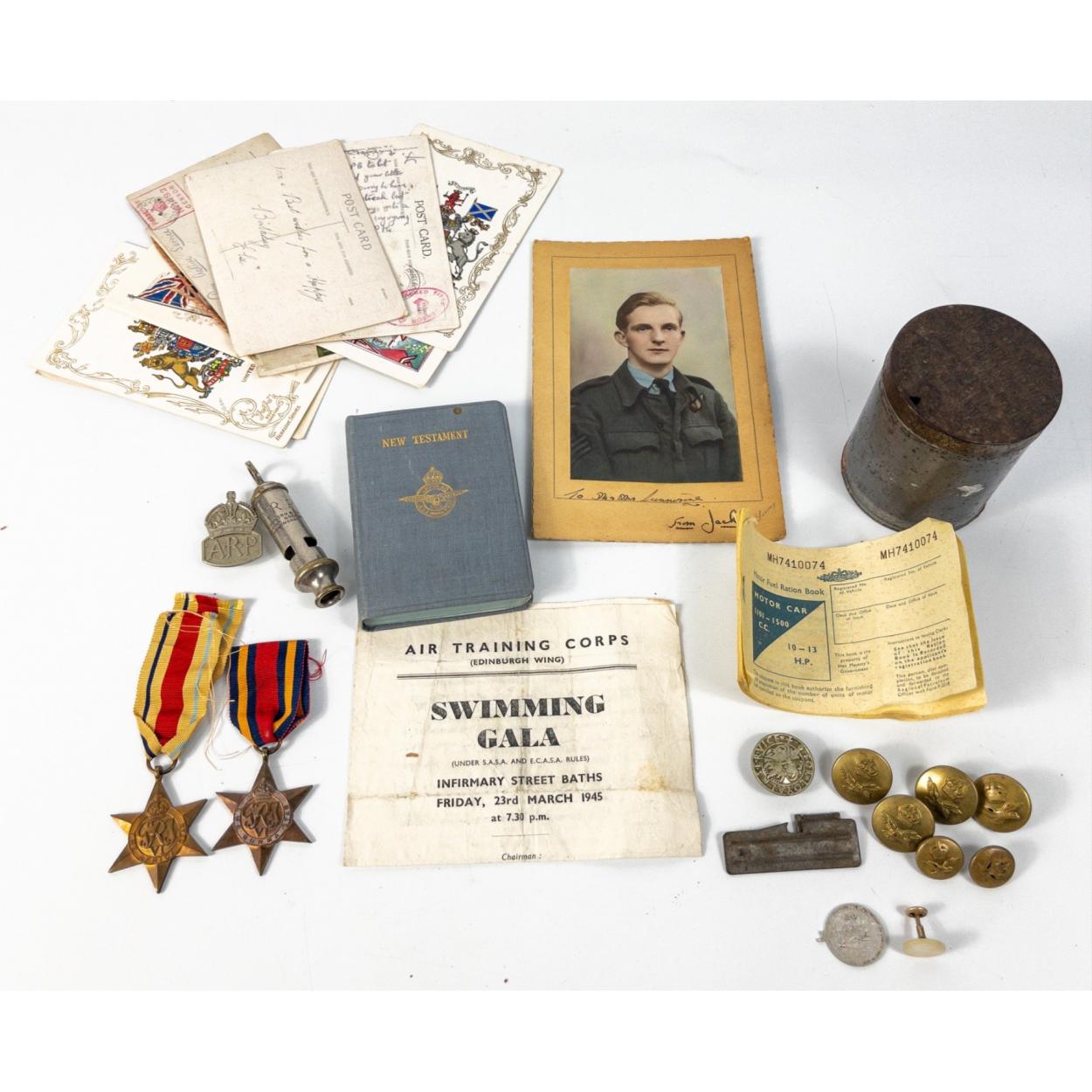 WWII MEDAL bundle pertaining to 'Jack' a WW2 RAF Signaller possibly from Innerleithen. including his photo in uniform , some earlier postcards, his BURMA STAR and AFRICA STAR, a HudsonnARP whistle and ARP badge along with his service issue bible. Also included a Players Navy cut tin with WW2 Petrol ration Book minin tin opener and buttons. Lot to include a framed (no glass) George VI letter to Children at School and a large publication 'The Italian Campaign, Royal Armoured Corps.