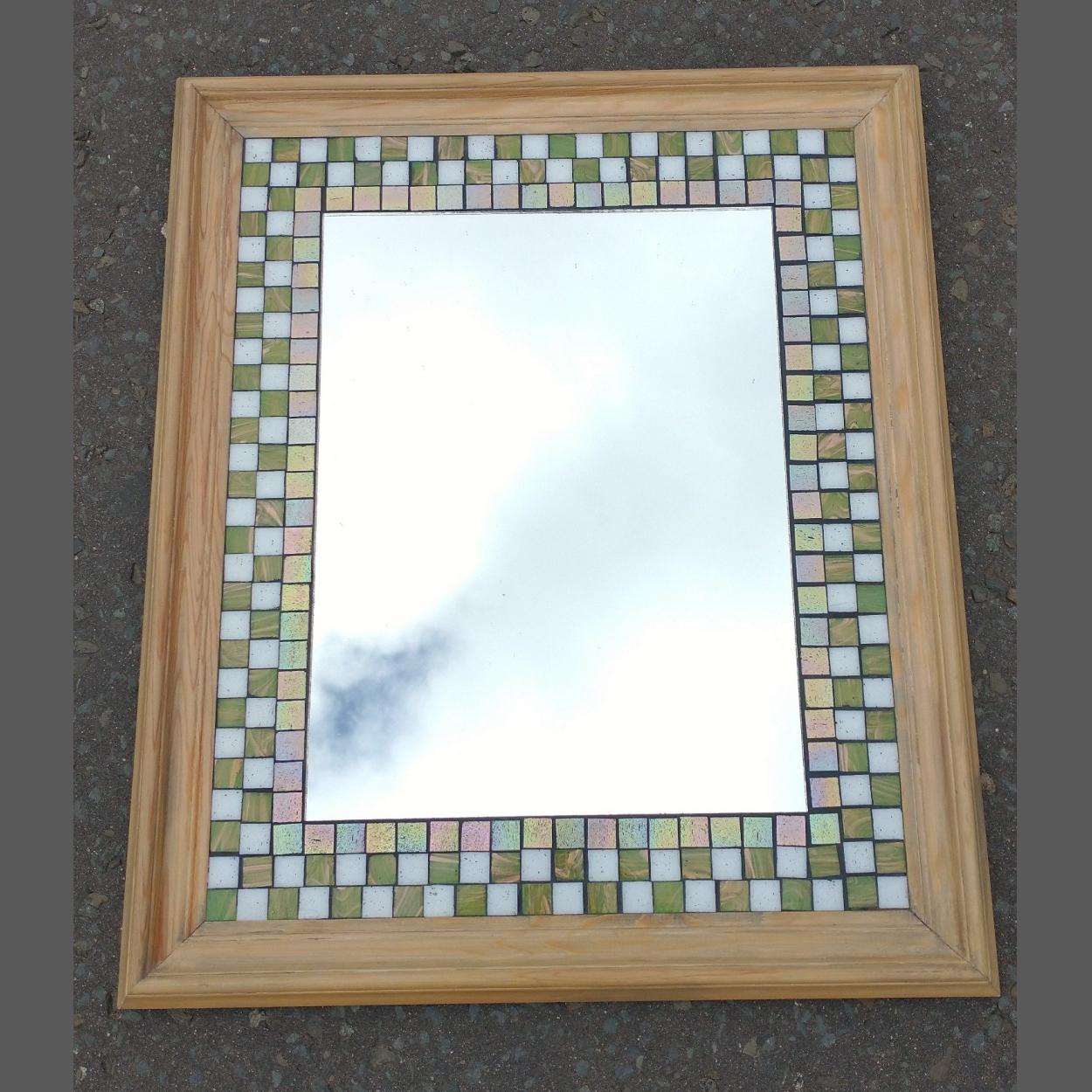 A top quality wall mirror made by a member of Blind Veterans UK, wooden frame measures 65x55cm approx, decorated with a triple row of small mosaic squares, mirror size 43x33cm