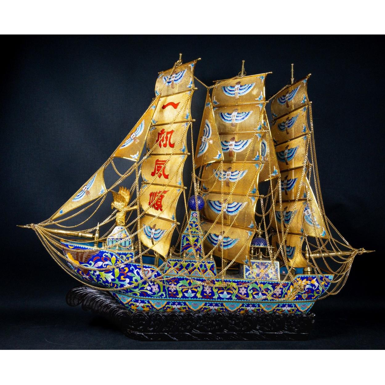 IMPRESSIVE DECORATIVE VERY LARGE ORIENTAL Red Copper/brass Cloisonne enamelled Galleon ship in full sail with good luck statues sitting on a carved wooden oriental base - there is slight gilding missing from the tip of one of the wings of the good luck eagle statue, a little minor scratches as one would expect commensurate with age etc - but a beautiful decorative piece! - dimensions 112cm length x 85cm height
