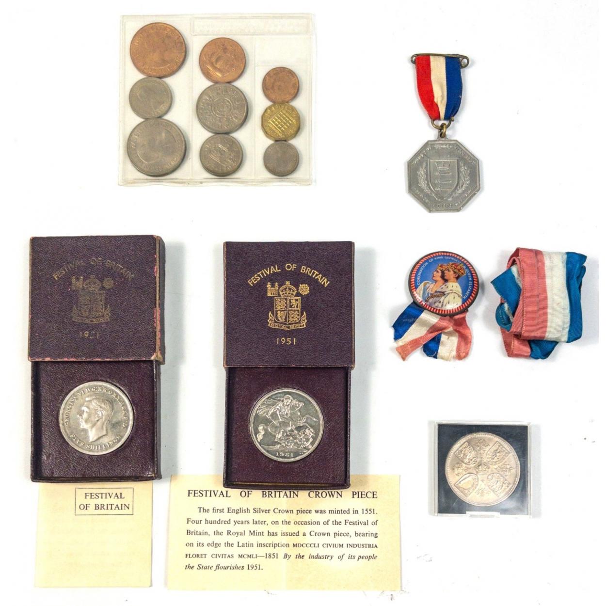 A set of 1953 UK coins, 2 Festival of Britain 1951 crowns, a 1953 five shillings coin, and a Middlesex County Council coronation medal 1935