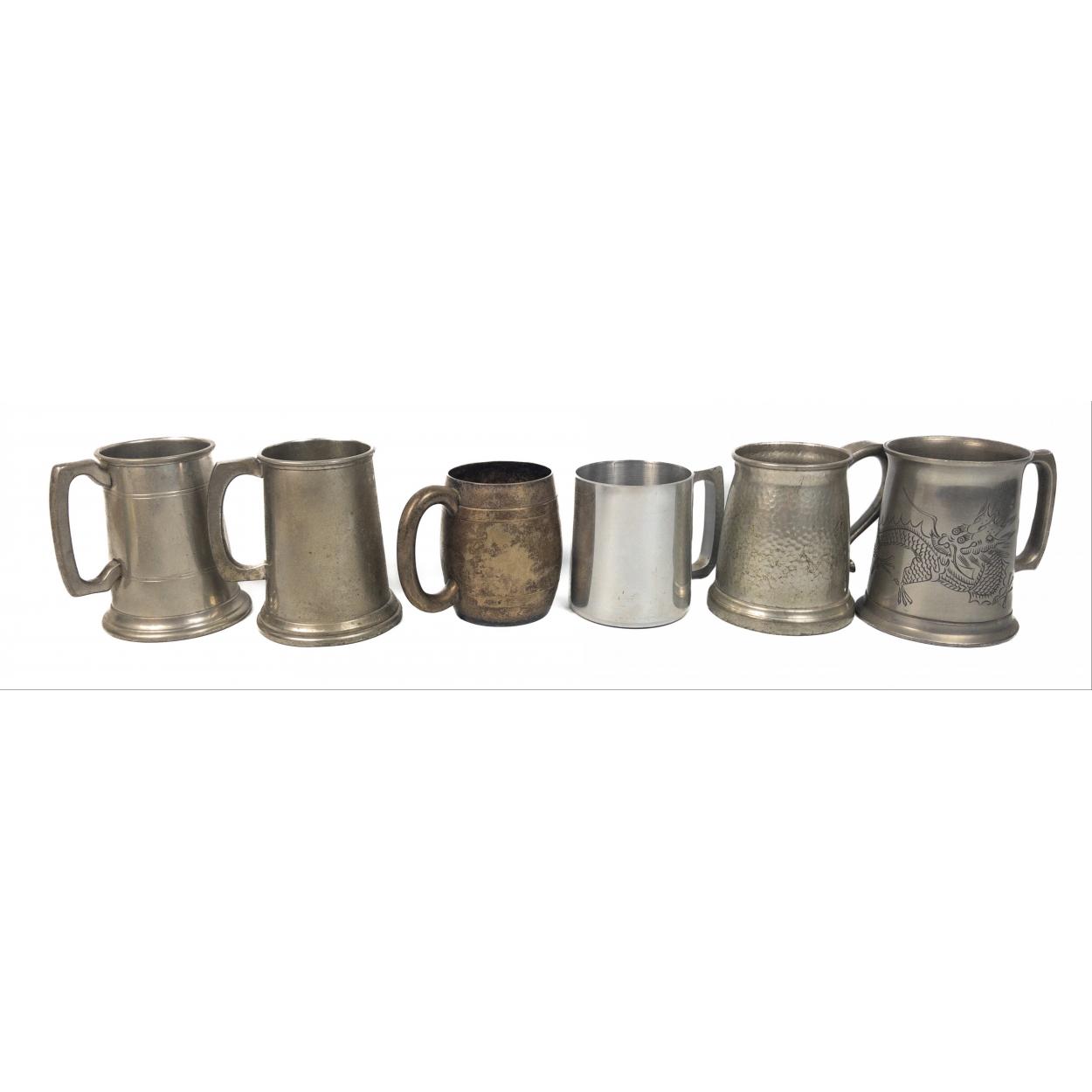 A collection of six old tankards, some pewter
