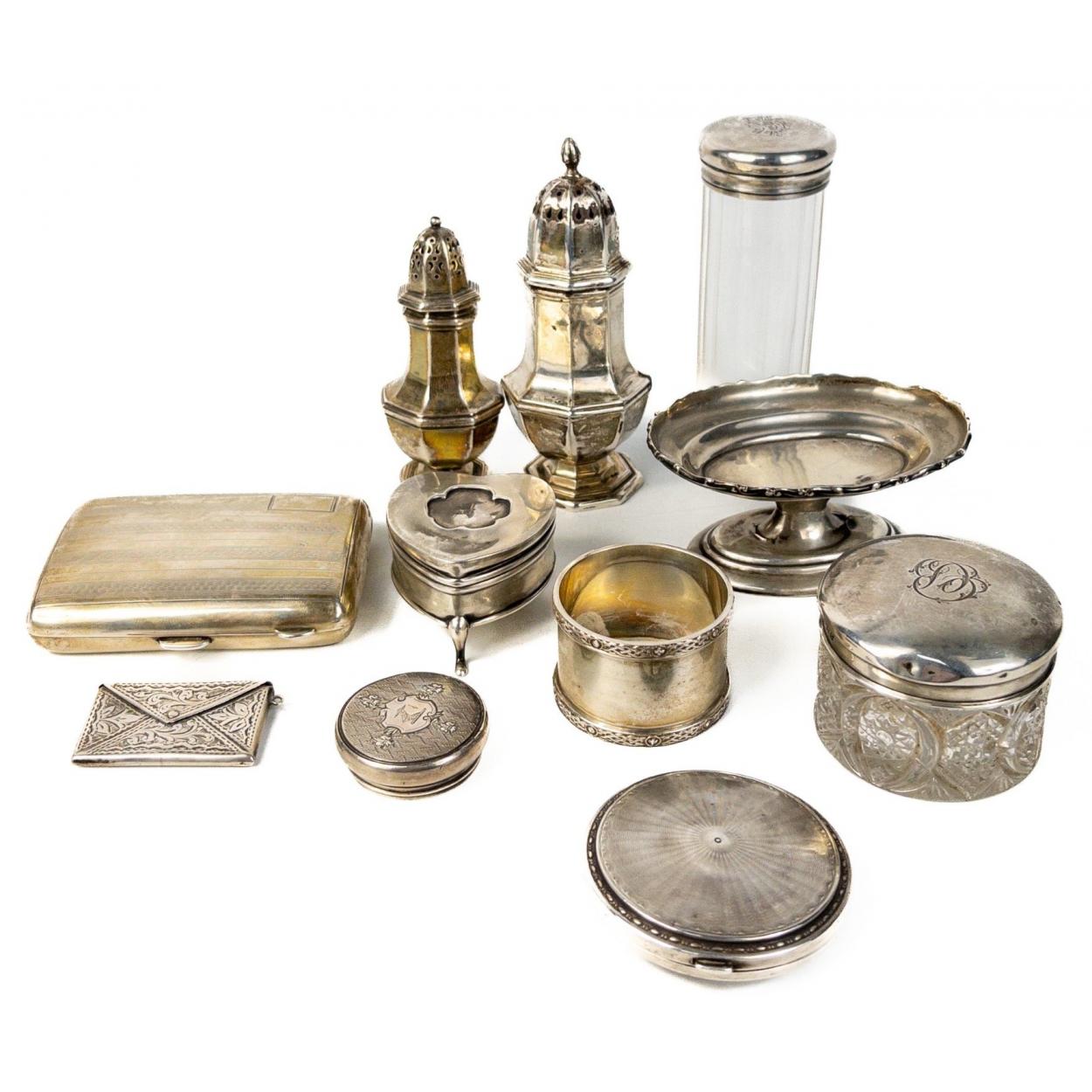 An intriguing collection of hallmarked sterling silver items to include two small sifters, pin tray, napkin ring, cigarette case, two silver topped glass bottles with one loose top, a stamp holder and a pill box. Total gross weight excluding the glass bottles is 315g approx.