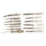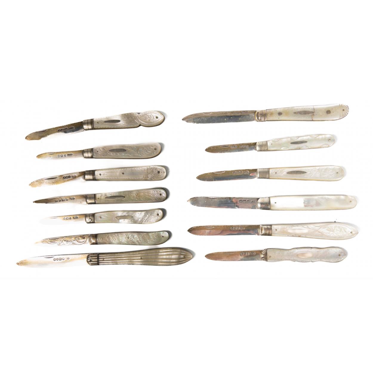 NOW WHERE DID I PUT MY POCKET KNIFE? A super collection of thirteen (Yes, Thirteen!) Mother of Pearl handled silver bladed (all hallmarked) fruit knives. Various makers, dates. etc. A few little bends and blunted tips but a really super collection.