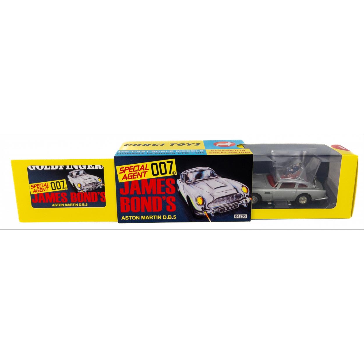 THREE ORIGINAL Die-cast scale model No 261 ASTON MARTIN DB5 from the James Bond film GOLDFINGER x 3qty model cars model No 261, all three original, but one is a reproduction box, but original car, all three cars original - all complete with their ejector-seat man in place - scale 1:43