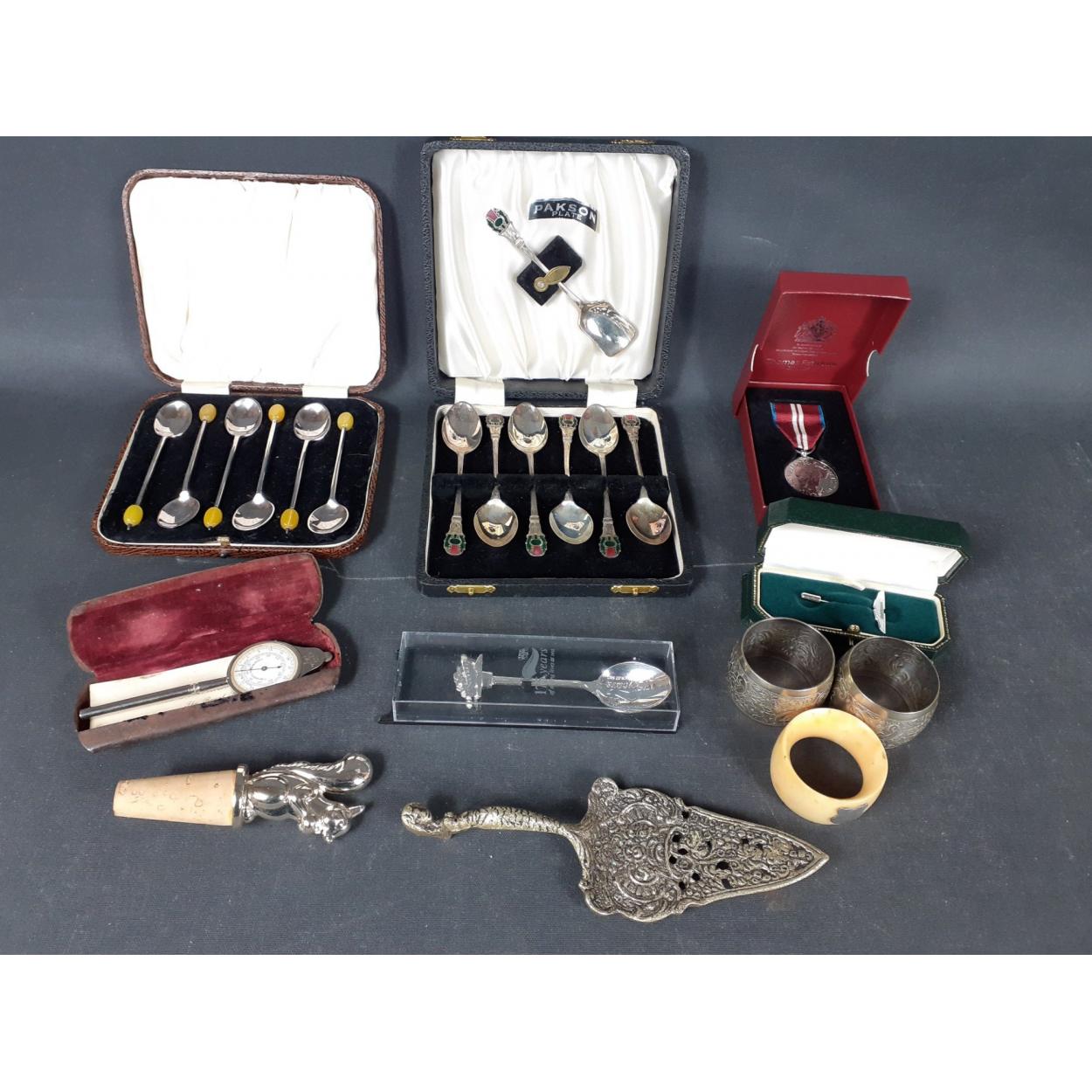 A selection of SILVER PLATE items to include two sets of cased teaspoons, a pair of NAPKIN RINGS , a DIAMOND JUBILEE MEDAL, a bottle stopper with a SQUIRREL top, an ASTON MARTIN tie pin in original box, MAP READING tool , etc