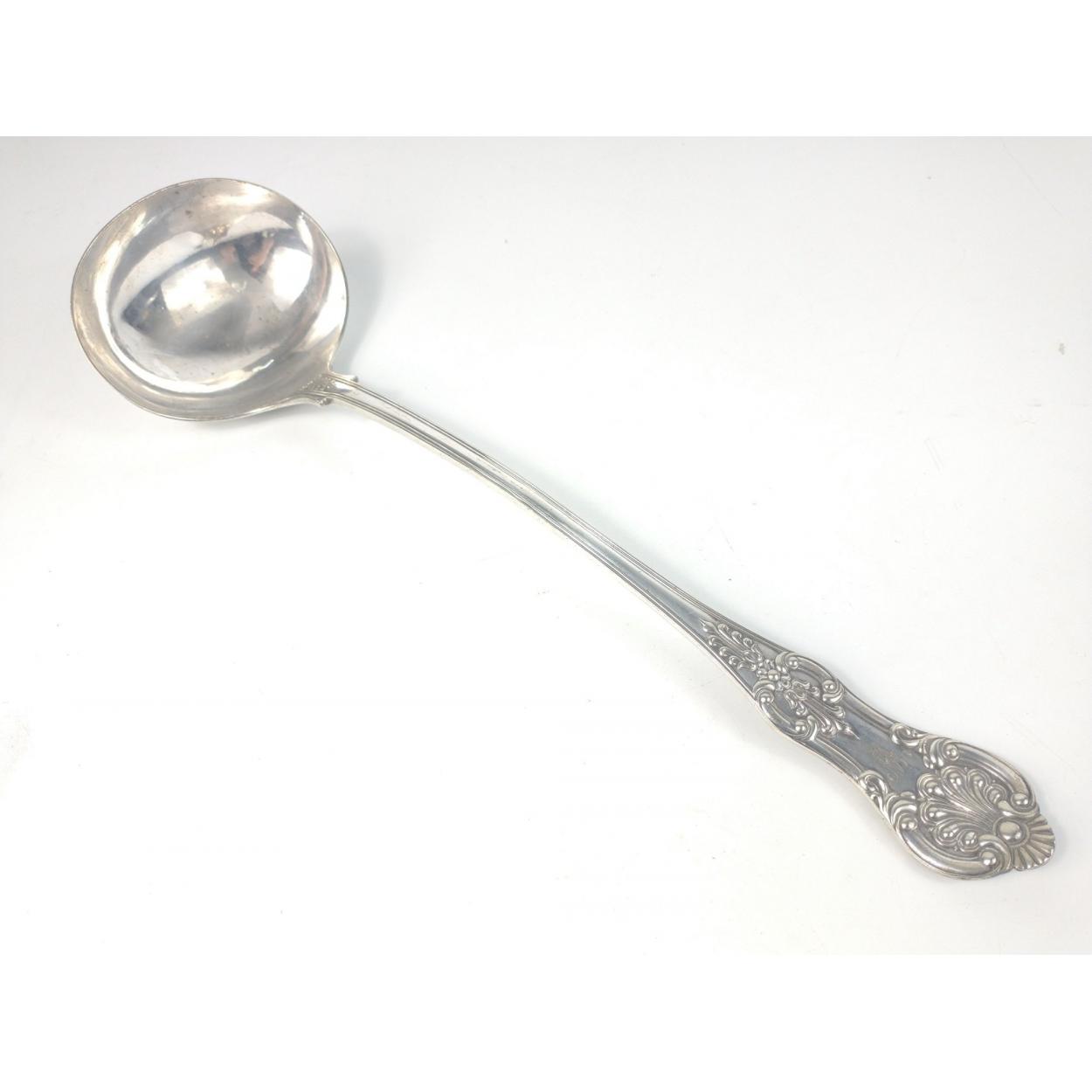 A VINTAGE good quality SILVER PLATE soup ladle 36cm long and engraved with the initial W on the handle