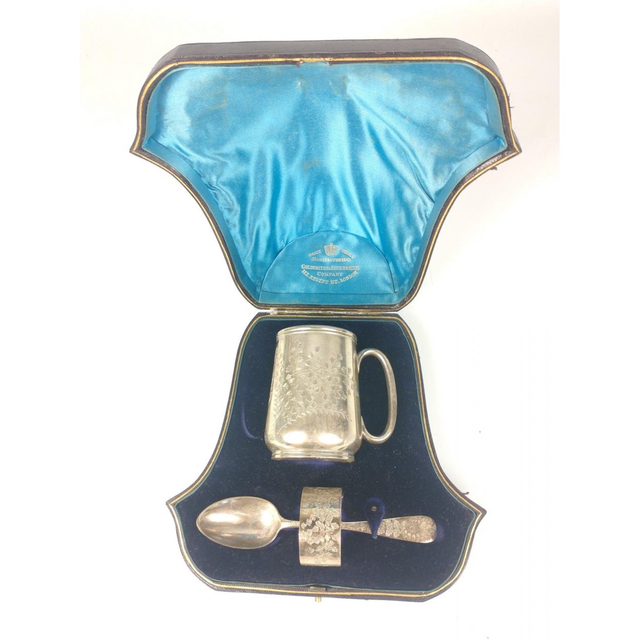 GOLDSMITHS AND SILVERSMITHS Co Regent Street London christening set SILVER 1881 hallmarked christening mug weight 100.08g approx, a matching teaspoon 22g approx and a matching napkin ring weight 21.40g approx - all within its original VICTORIAN 1881 blue silk lined presentation case
