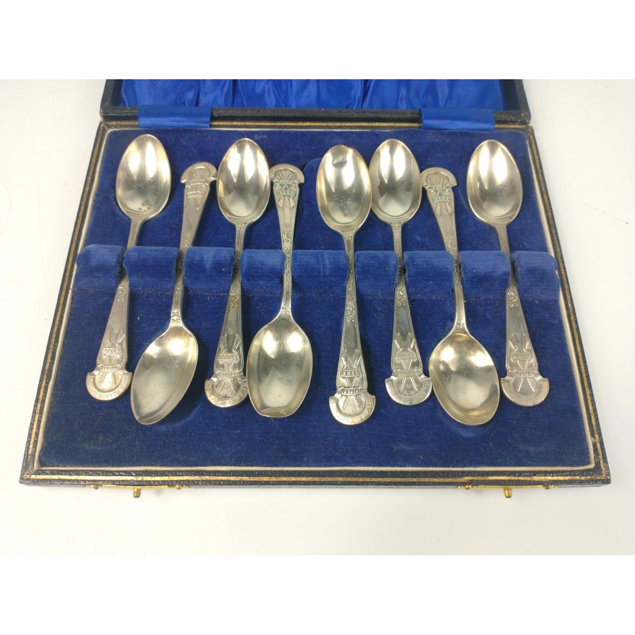 A set of eight RIFLE CLUB silver teaspoons all within a jewellers presentation case weight 112g approx, inscribed with 'Mlanje Section' and 'N V R'