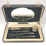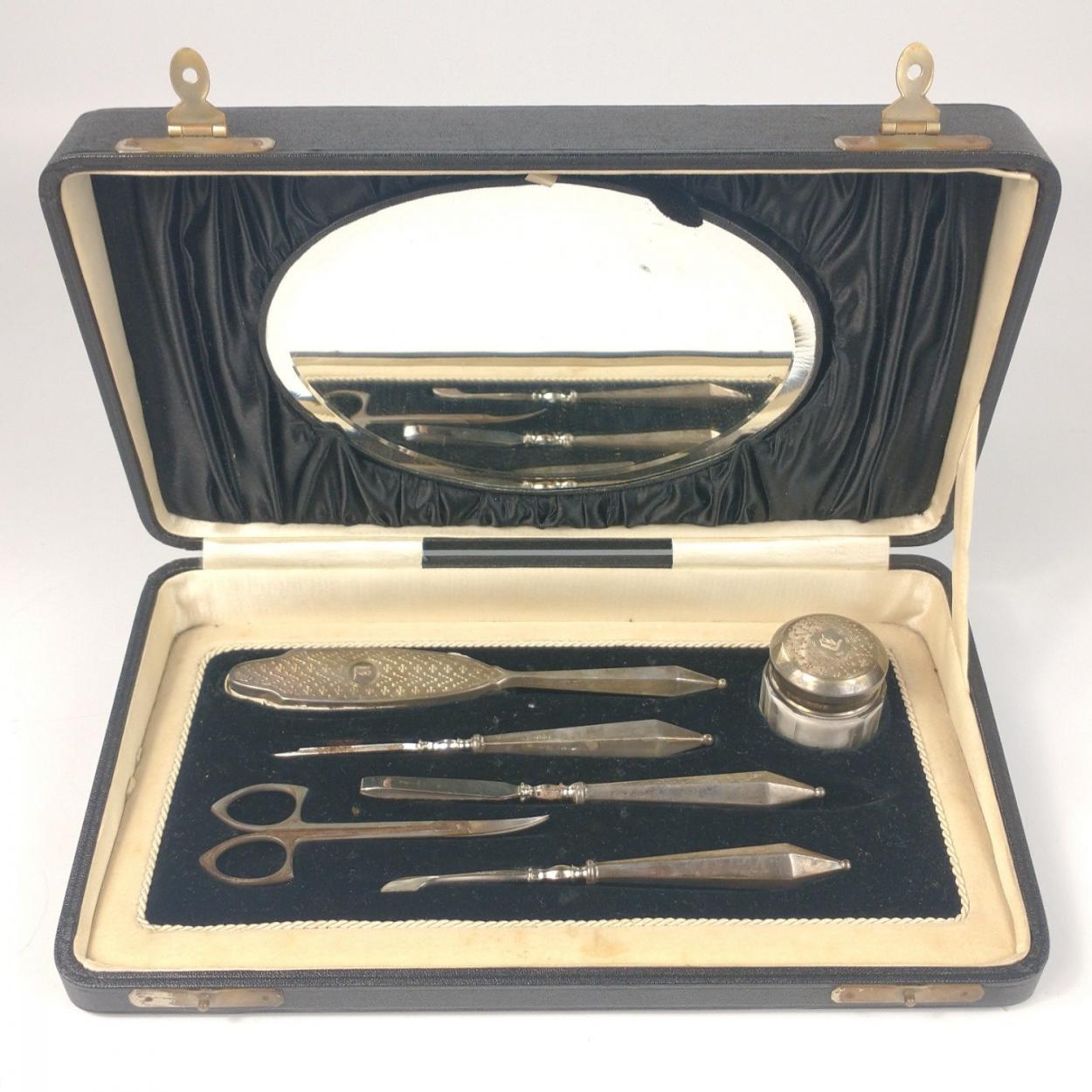 A SILVER BIRMINGHAM hallmarked pedicure set within its original black silk lined box with mirrored back (the only non-silver item is the scissors, which fit the original space ) and silversmith DM and Co stamped