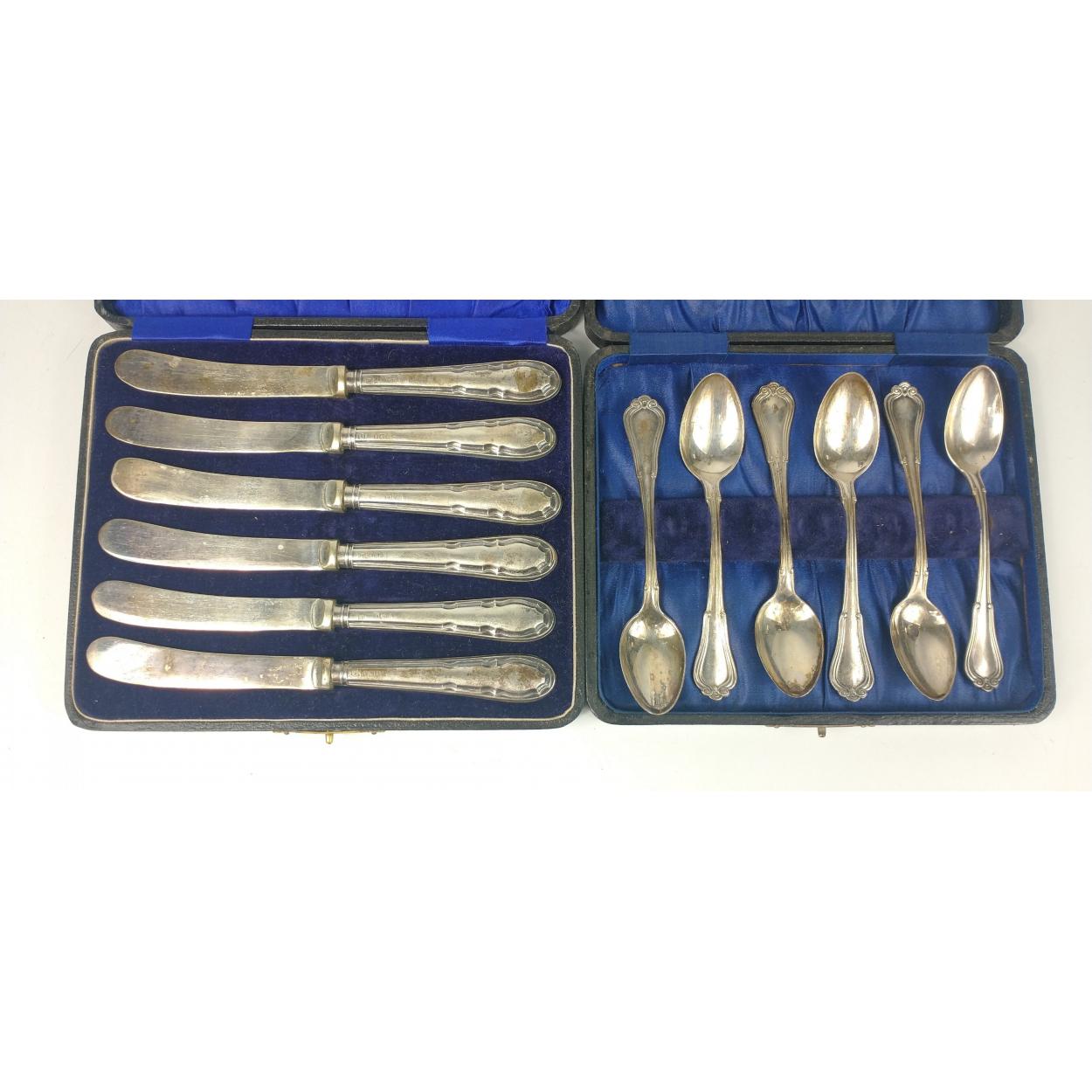 Two cases of silver cutlery to include Birmingham 1919 teaspoons by G.M. &Co (90g approx) and set of Sheffield 1918 silver handled knives (approx 190g)