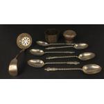 NICE EXAMPLE six EP twisted-stem APOSTLE teaspoons length each 10.5cm approx with also a silver BIRMINGHAM hallmarked single napkin ring in hexagonal form weight 21.75g approx and a silver cane top with a hallmark for Birmingham weight 7.42g approx and lastly a NEVADA SILVER small sugar sifter in ladle form 23.5g approx
