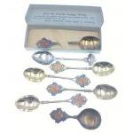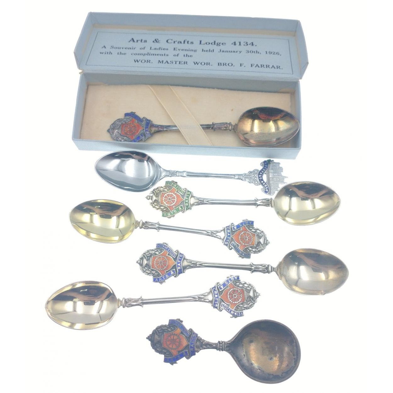 RARE! - Arts and Crafts inspired MASONIC tea caddy spoon with Arts and Crafts and LODGE No 4134 inscribed on the blue enamelled handle, with the Masonic Round Table depicted in red enamel - Birmingham Hallmark by Silversmiths AS and Co - dimensions 8.5cm length and gross weight 22.36g approx, with also an Arts and Crafts Lodge 4134 souvenir teaspoon still in its box with four other enamel spoons out of boxes with also a white metal BUCKFAST ABBEY tea caddy spoon for the tourist market dimension 11.5cm length