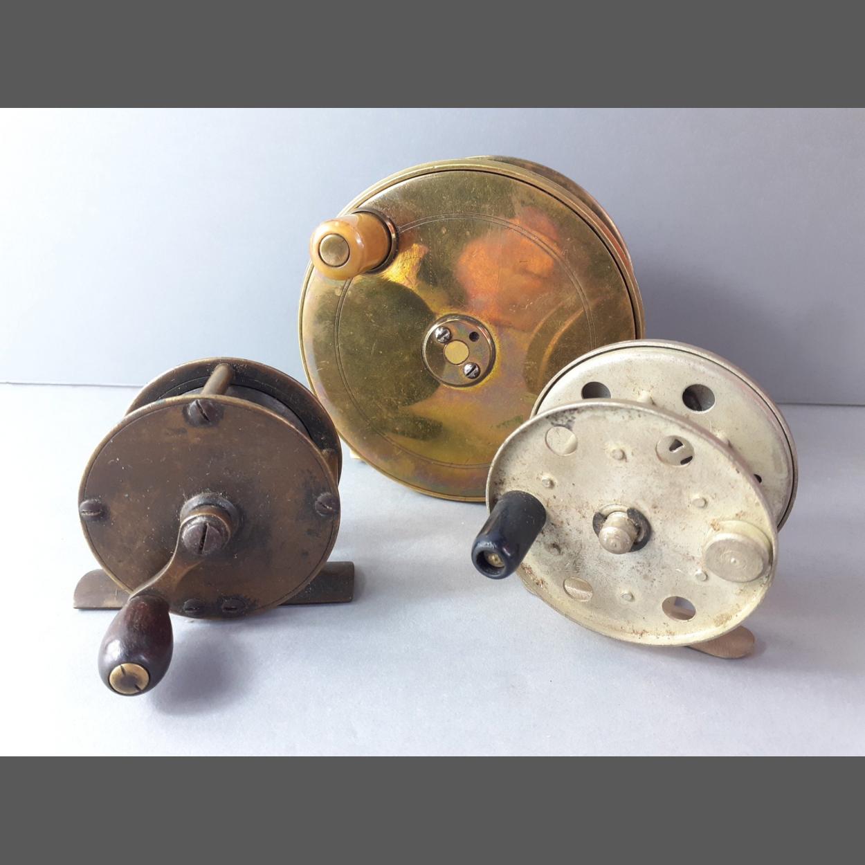 A large, solid brass 4 inch fishing reel with nice ratchet action in good condition. Un-named but a beautiful reel. Lot includes one other small brass reel and a ETON SON tin centre pin reel