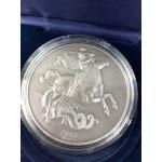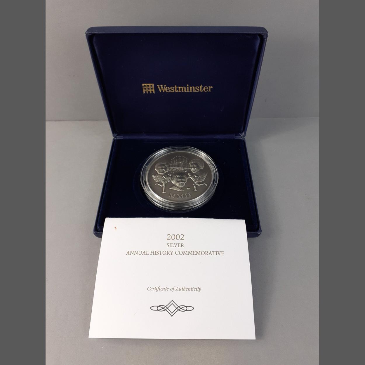 A 2002 WESTMINSTER MINT silver annual history commemorative medallion of St George and the Dragon obverse 5 ounce .999 silver antique matt finish, limited edition 12/300 in presentation case and slip case
