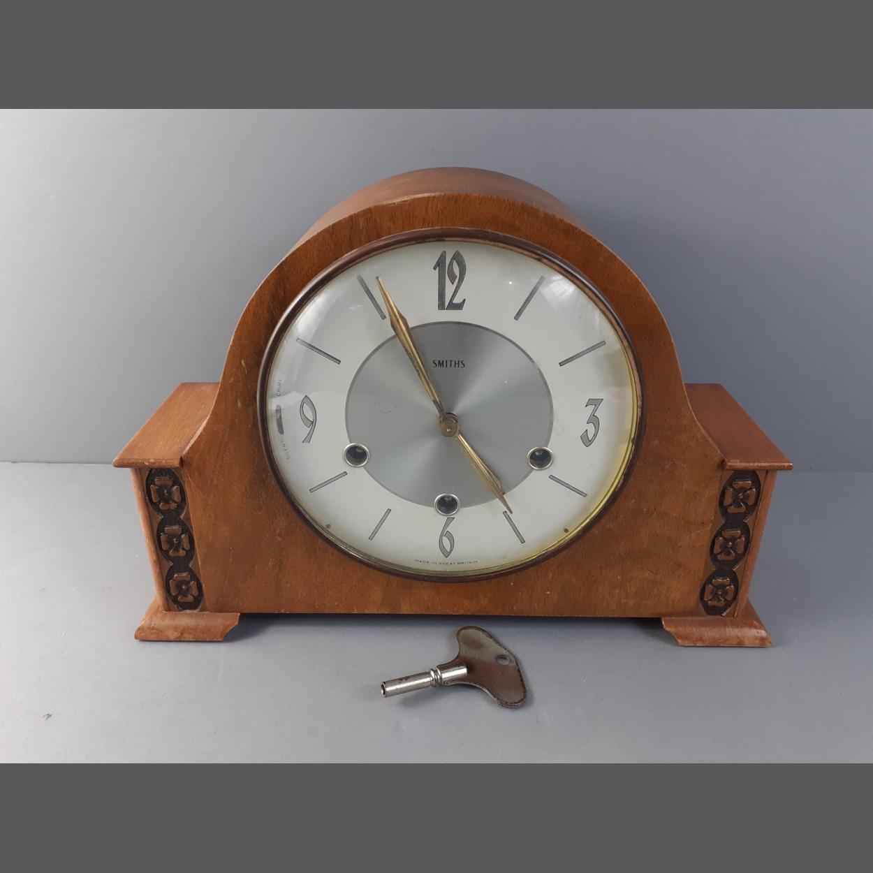 A rather attractive vintage SMITH'S mantel clock supplied with key, in full working order, has silent chime option, stands 21cm high x 30cm width