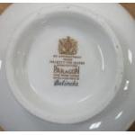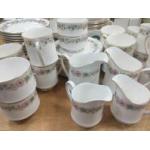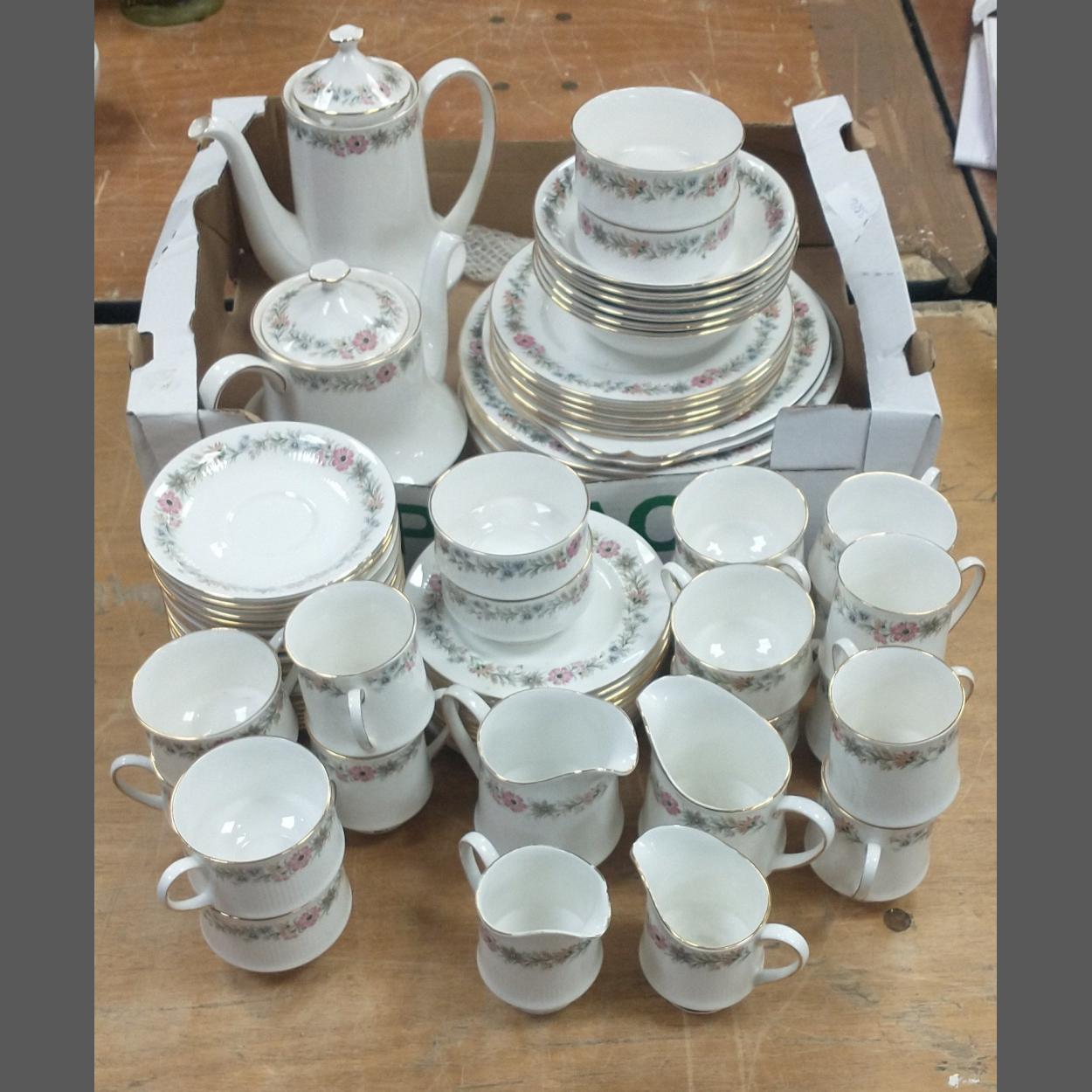 A large quantity of PARAGON Belinda pattern china to include 10 teacups, 6 coffee cans, 19 saucers, 14 side plates, 8 dinner plates, 6 salad plates, 6 bowls, 2 cake plates, 1 teapot, 1 coffee pot, 2 large sugar bowls, 2 small sugar bowls, 2 creamers and 2 milk jugs. Apart from some rubbed gilding on one one side plate and one creamer, this collection is in good order