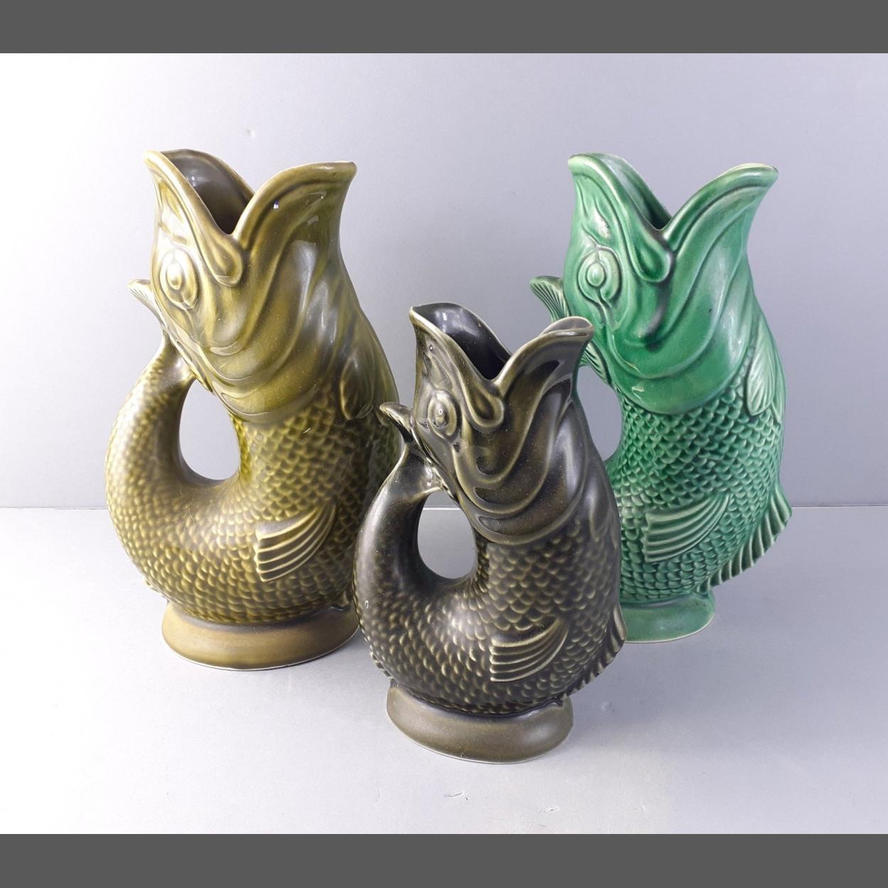 Three DEVON DARTMOUTH fish gurgle jugs the largest being 24cm tall. Nice collection in three shades of Green / Olive. All in good condition.
