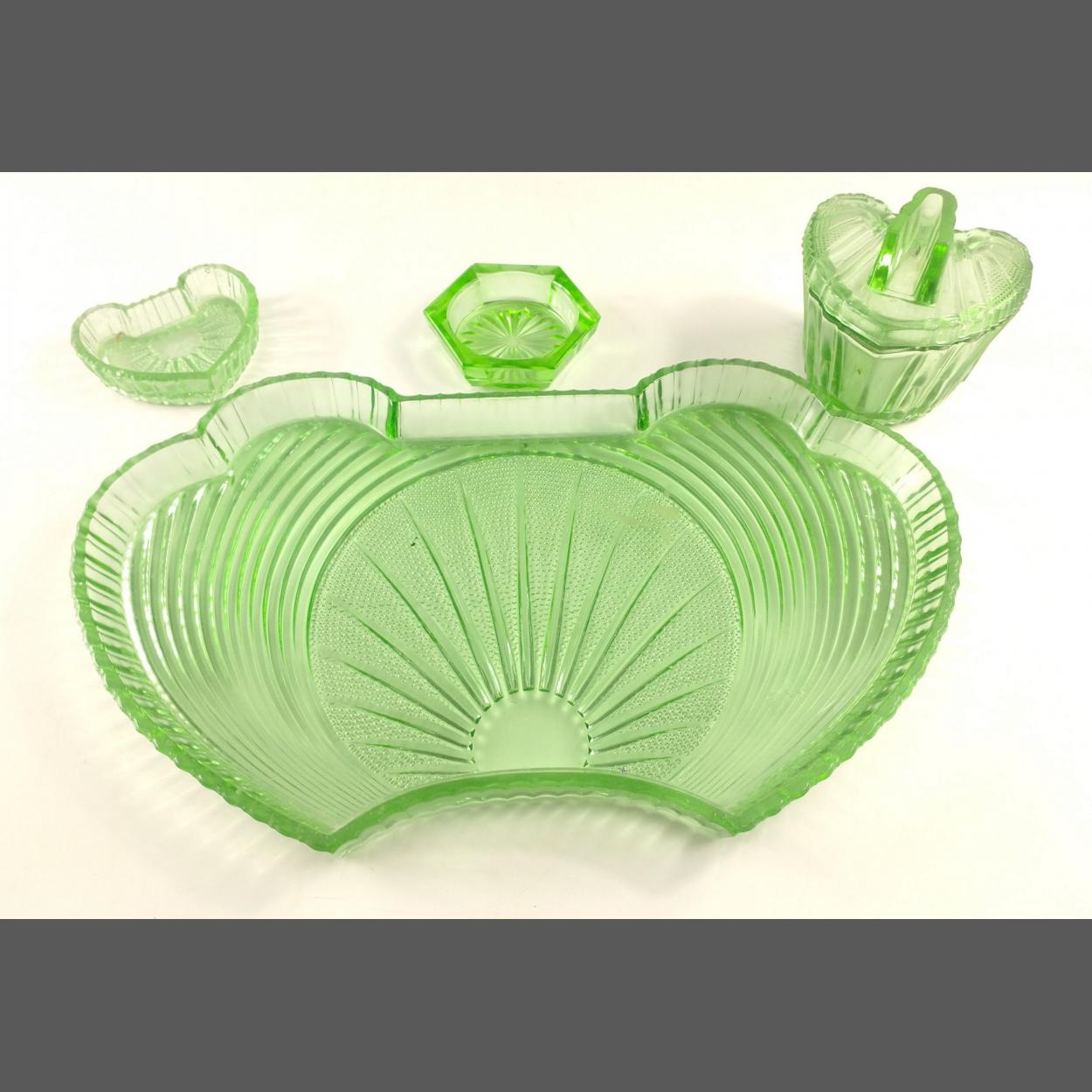 An Art Deco URANIUM GLASS dressing table set comprising a tray 35x22cm approx, 1 heart-shaped lidded trinket box 10cmH x10cmW approx, an open heart-shaped trinket dish plus one other