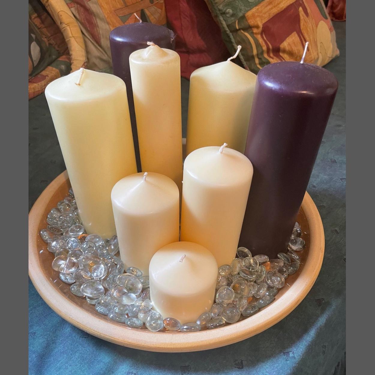 A nice collection of CHURCH inspired candles, mostly cream coloured with a couple of tall purple ones - tallest candle 10/12" approx - all on a bed of glass beads with a lovely SUBSTANTIAL studio pottery plate 14" diameter