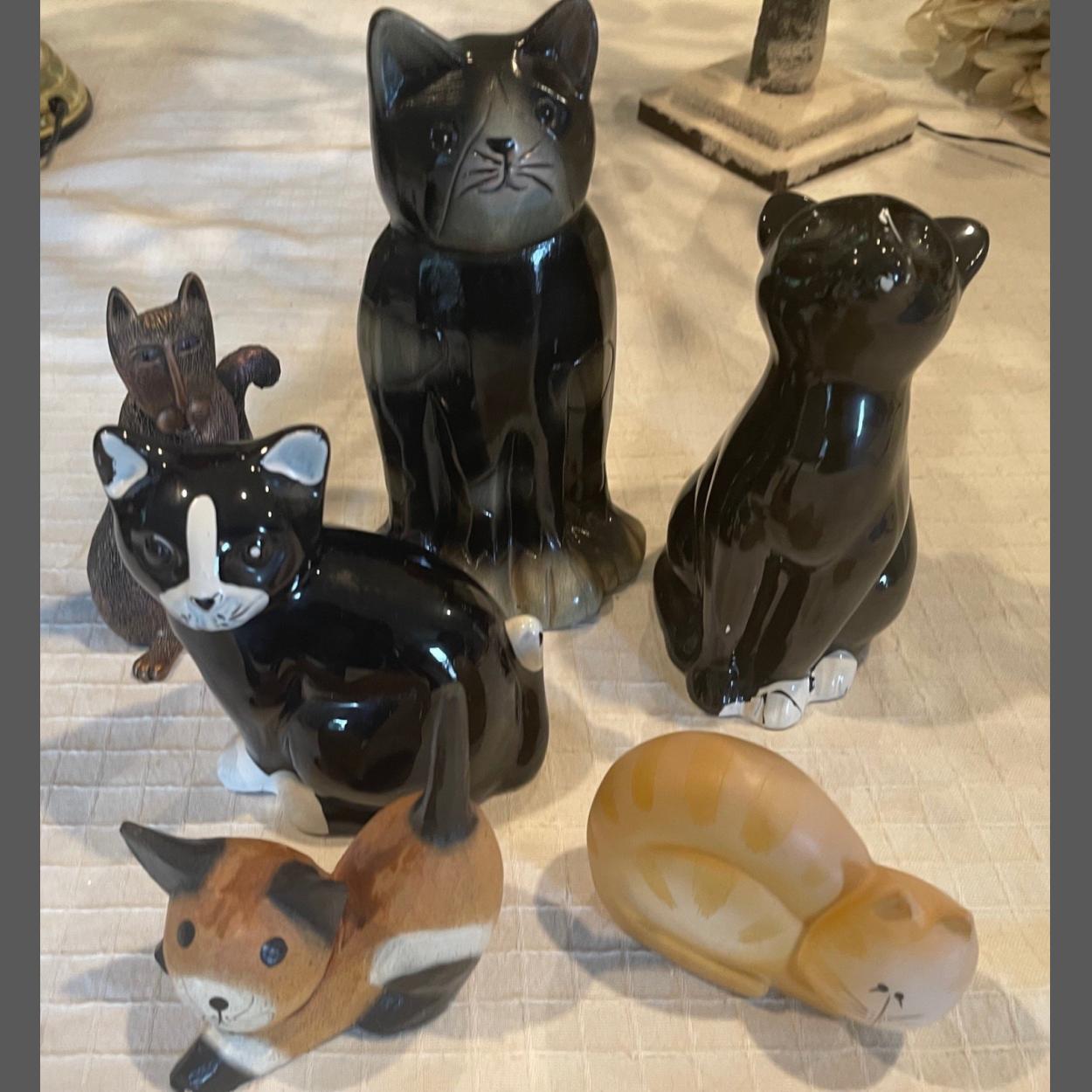 MEEOW! A collection of 6 mainly ceramic PUSSYCAT ornaments - tallest 30cm approx