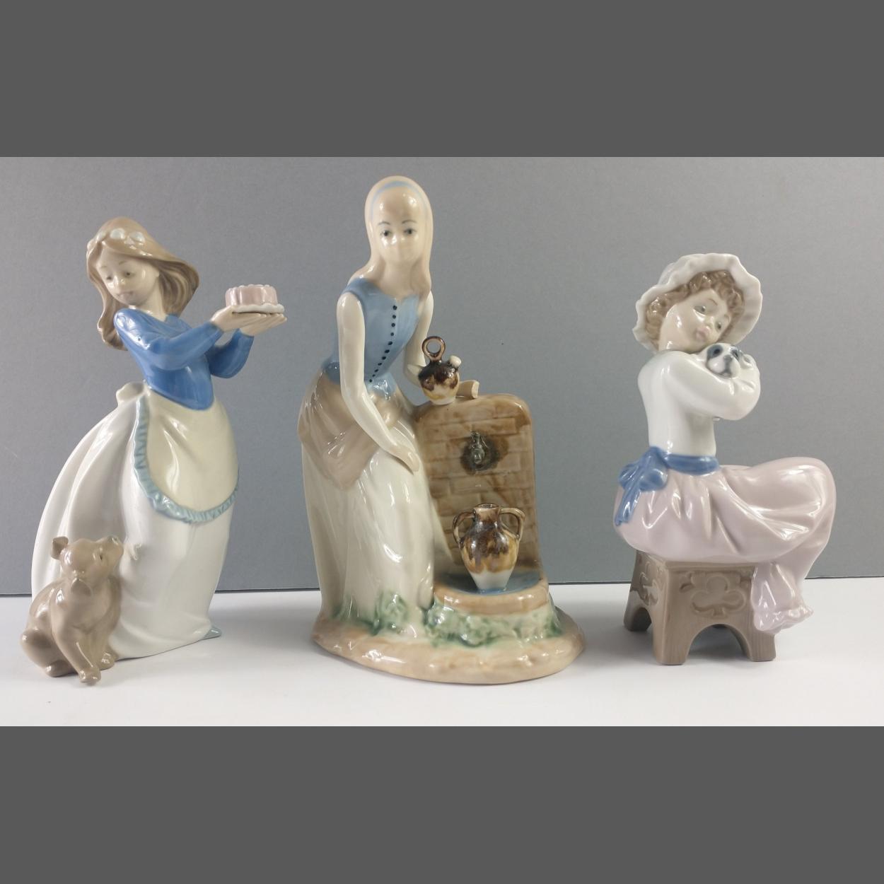 Two LLADRO/NAO figurines, the taller being 18cm, no damage and a ROUMANO figure of a lady standing 19cm approx