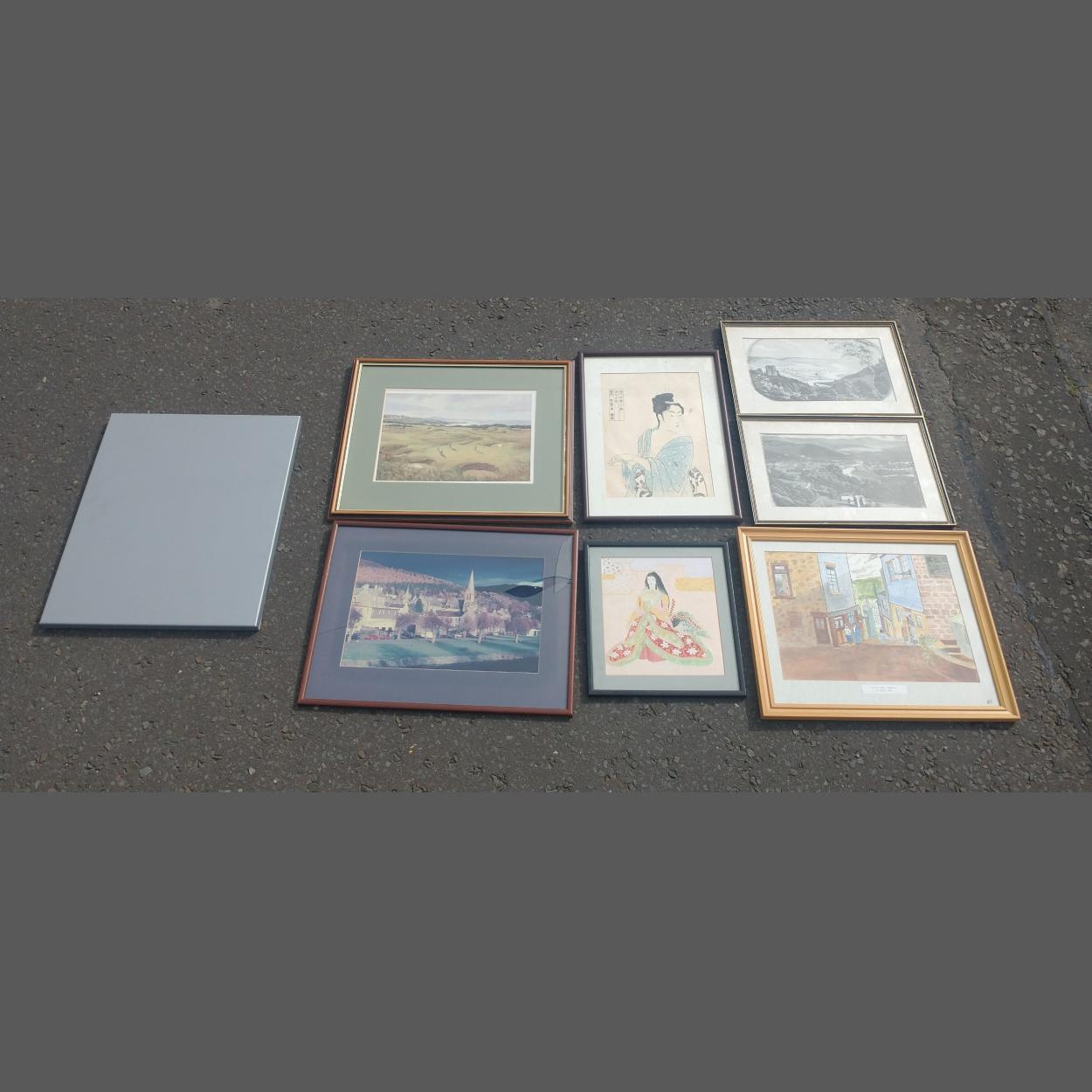 A selection of pictures including antique engraved images by BARRANCE, a 1980s frame photo, some Oriental prints and a WILCOX framed watercolour of Old St Ives in Cornwall