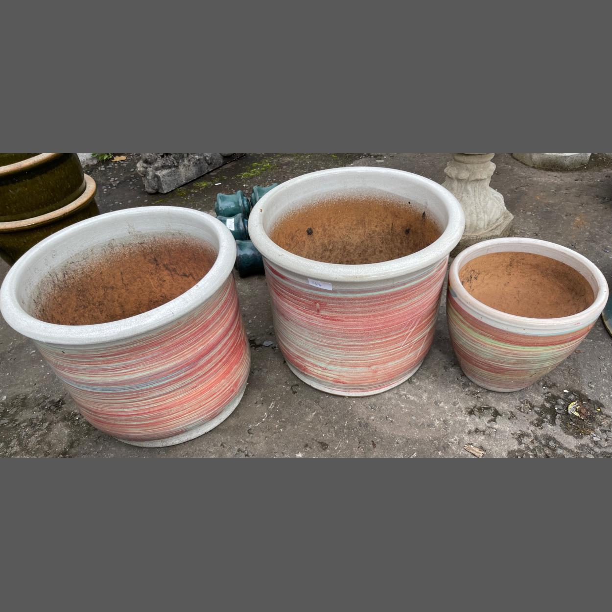 Three planters in multi-coloured stripes 2 largest are 30cm x 37cm