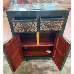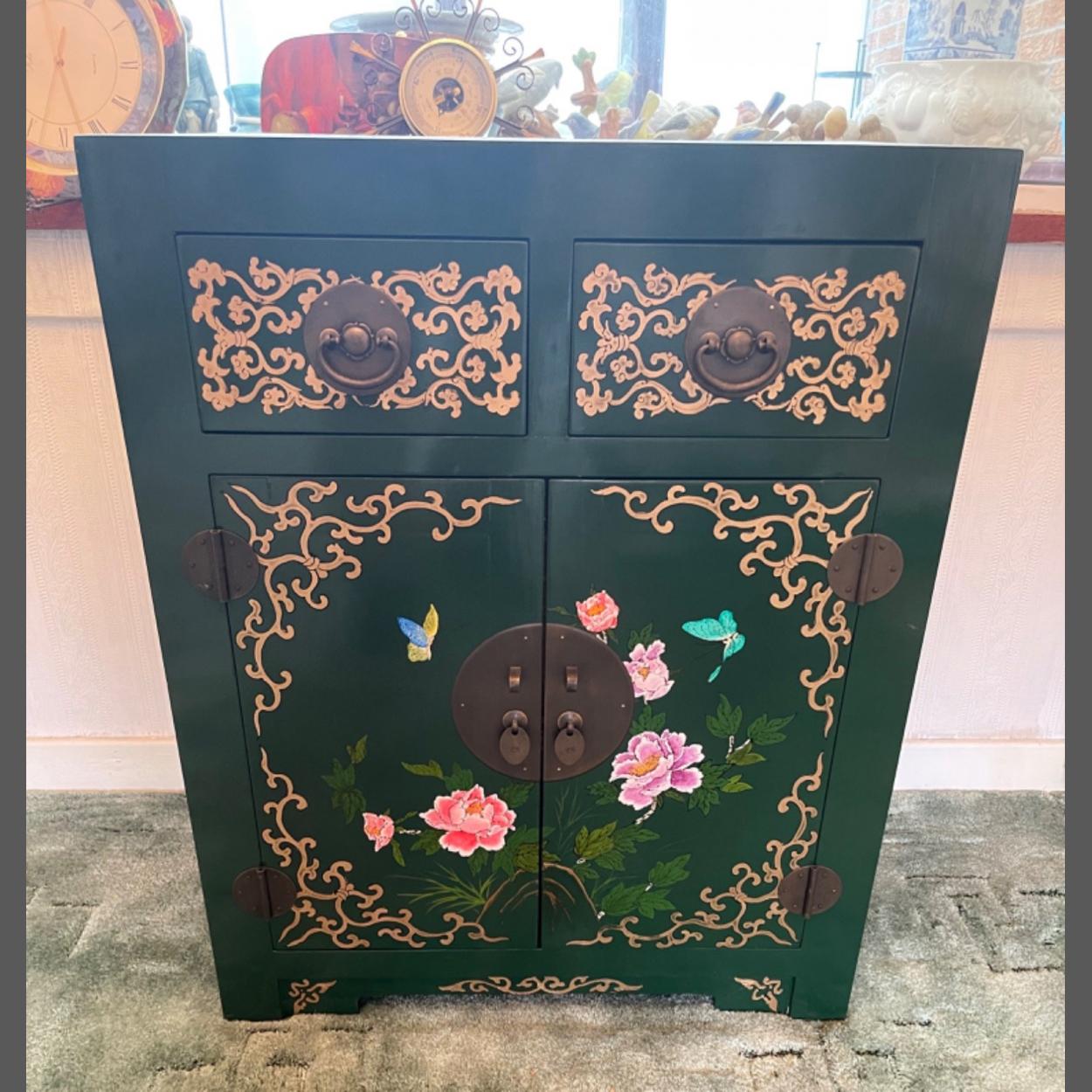 LOVELY QUALITY! An ORIENTAL inspired hand painted cabinet with floral decor and two drawers and two cupboard doors - dimensions 65cmwide x 85cm height x 40cm depth approx