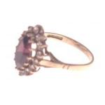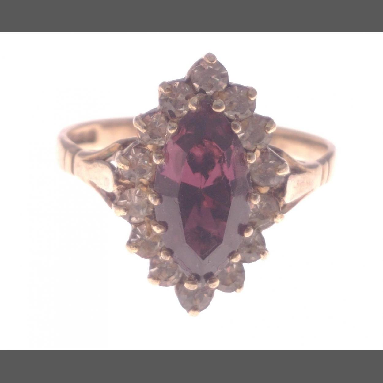 An unmarked yellow metal dress ring, marks indistinct, set with a backed red stone surrounded by white stones size Q, gross weight 2.60g approx