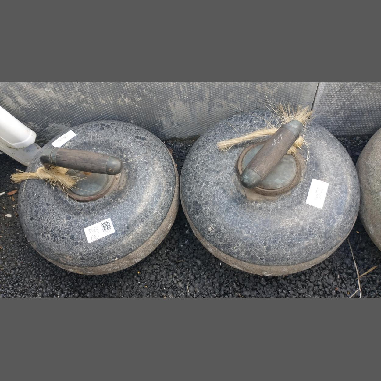 A lovely pair of antique AILSA CRAIG curling stones in good condition complete with original wooden handles. Very good order and they display beautifully.
