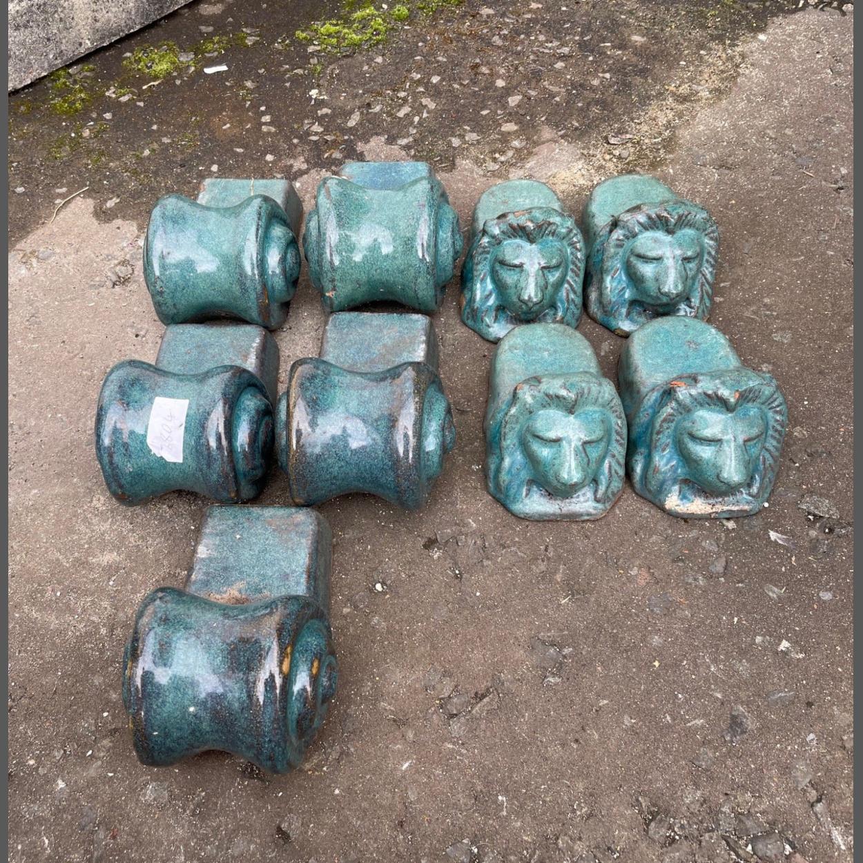 Four blue terracotta lion head plant pot stands plus 5 blue scroll plant pot stands
