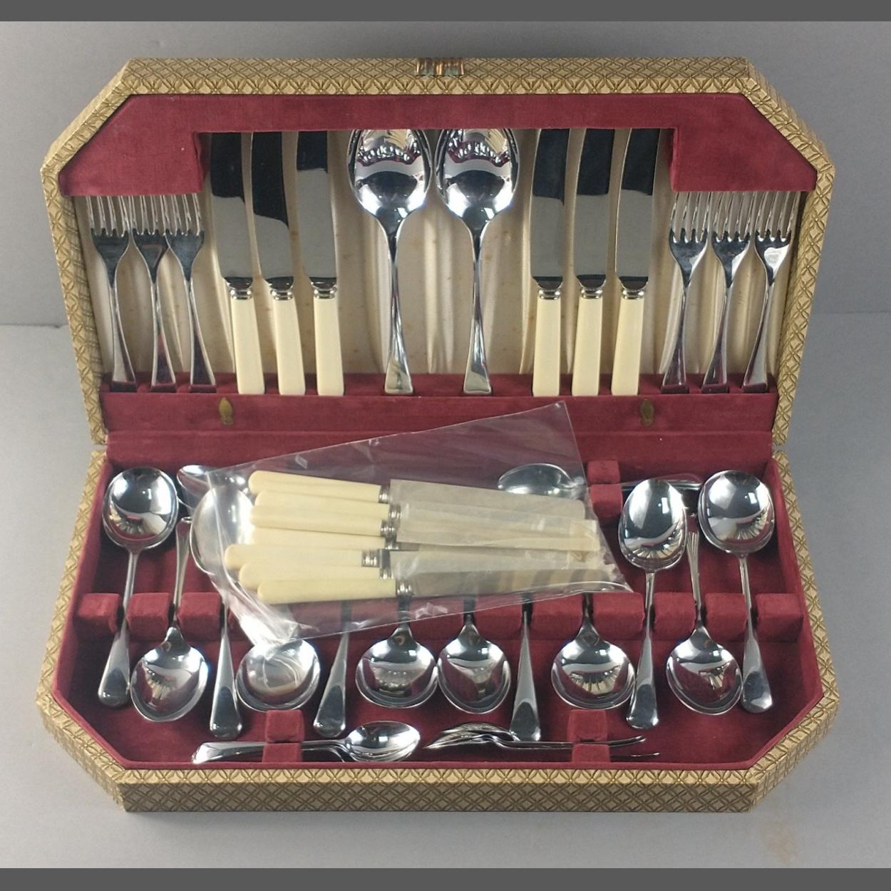 A lovely complete boxed set of cutlery in very good order, minor spotting to case. Lot includes a separate set of seven similar knives.