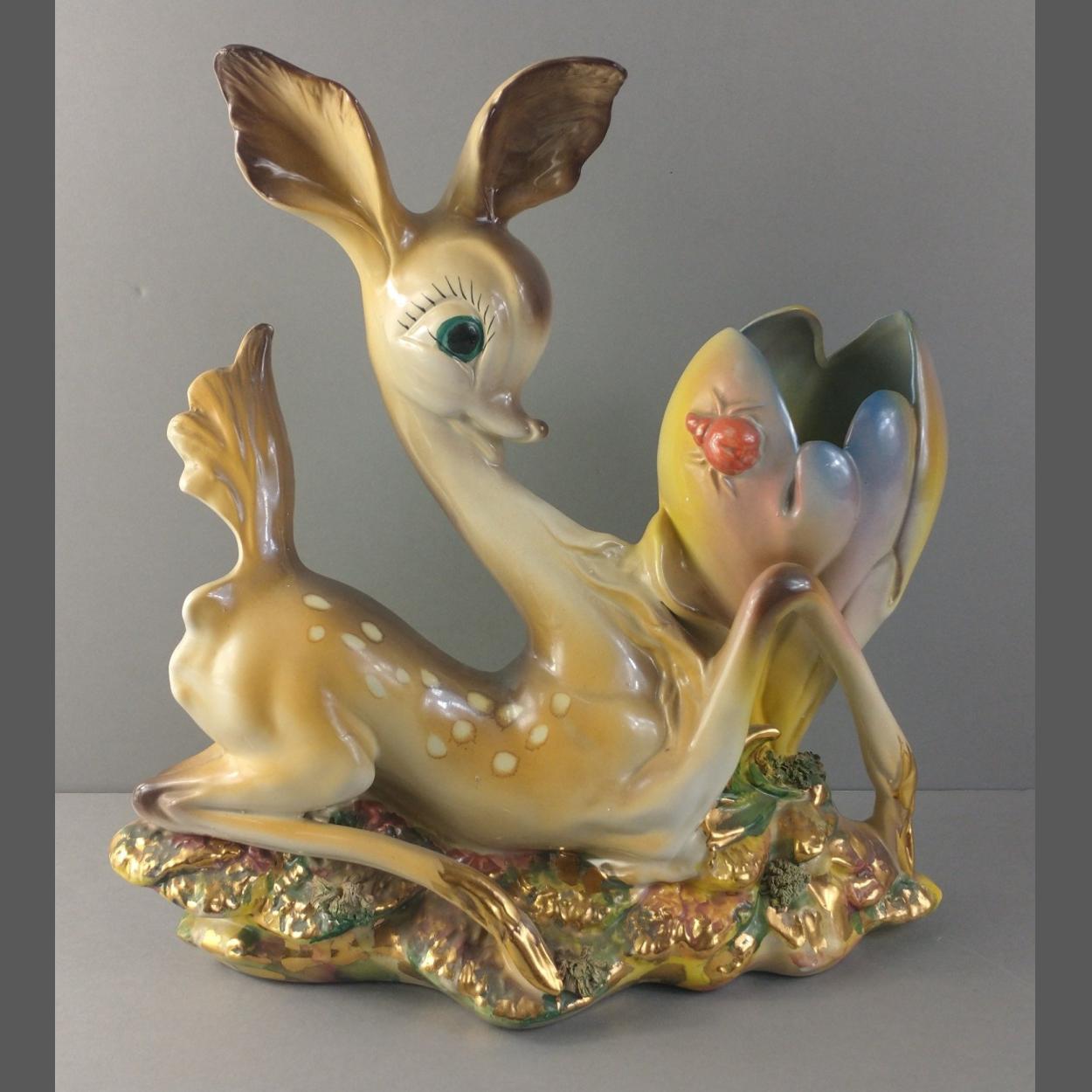 A very unusual BAMBI style vintage flower or spill vase. Very Kitsch style with Bambi having elongated limbs and over-attenuated neck and ears. The whole with a gilt finish is really rather appealing and is in good condition, one very minor chip to the rear of the ear noted. Stands 34cm tall.