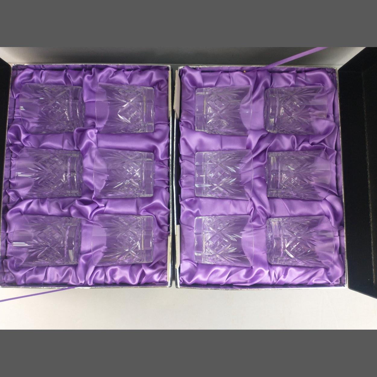 Two sets of EDINBURGH INTERNATIONAL hand-cut crystal 8cm high whisky tumblers. Each set contains 6 tumblers.