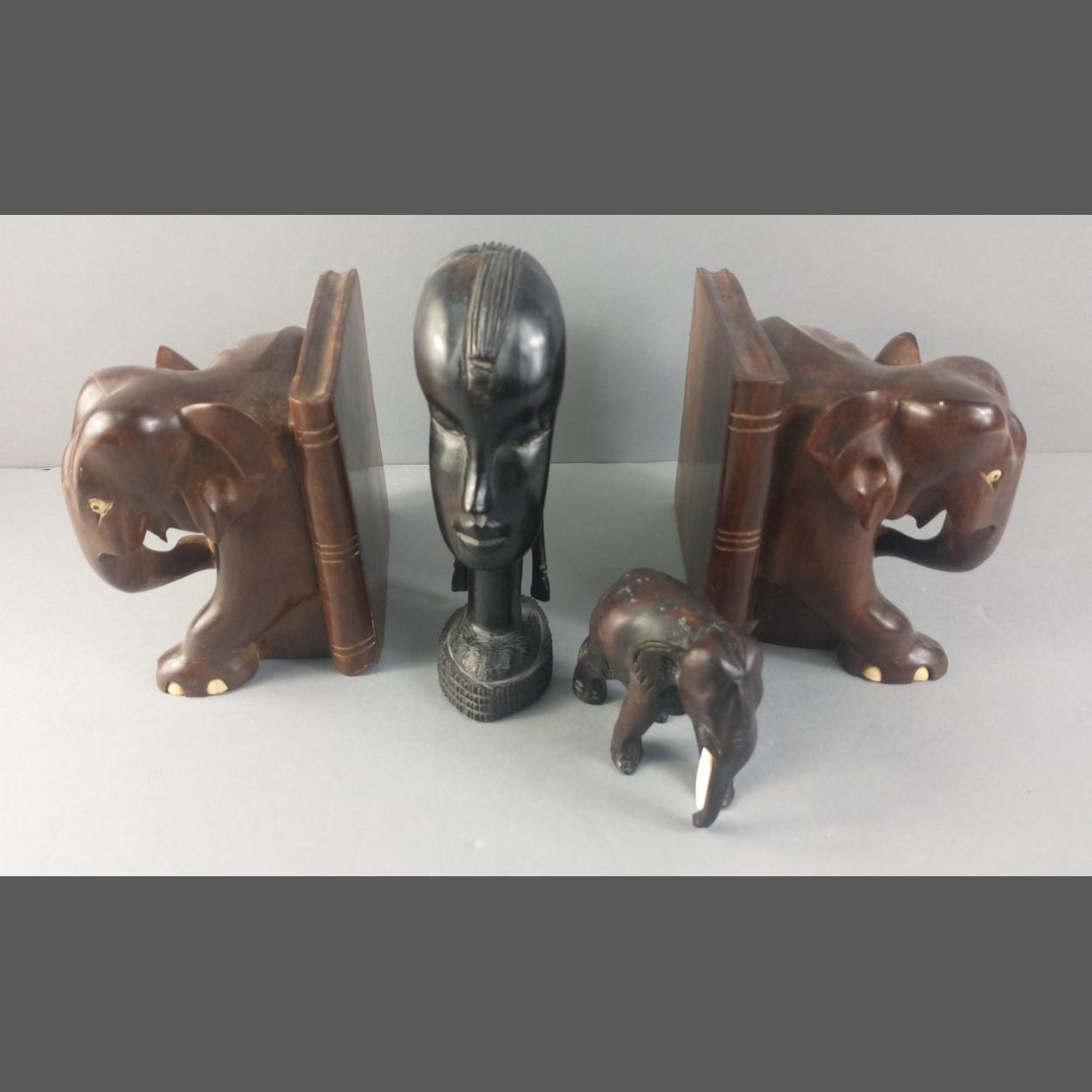 A collection of wooden artefacts including a pair of hardwood elephant book ends measuring approx. 13cmH x 14cmL. together with a small wooden elephant measuring approx. 8cm high and a wooden African woman's head measuring approx. 18cm. Slight damage to some of the items.
