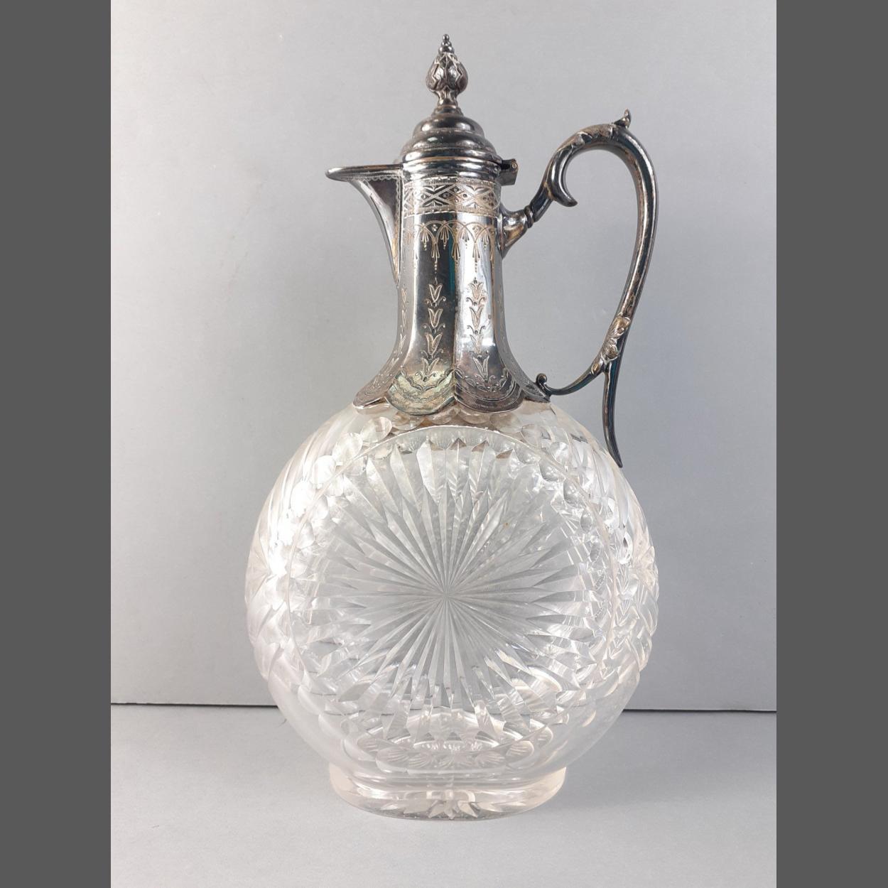 An ANTIQUE stylish cut-glass wine jug with unmarked white metal handle and fittings. Measuring approx. 27cm in height. Lovely condition.