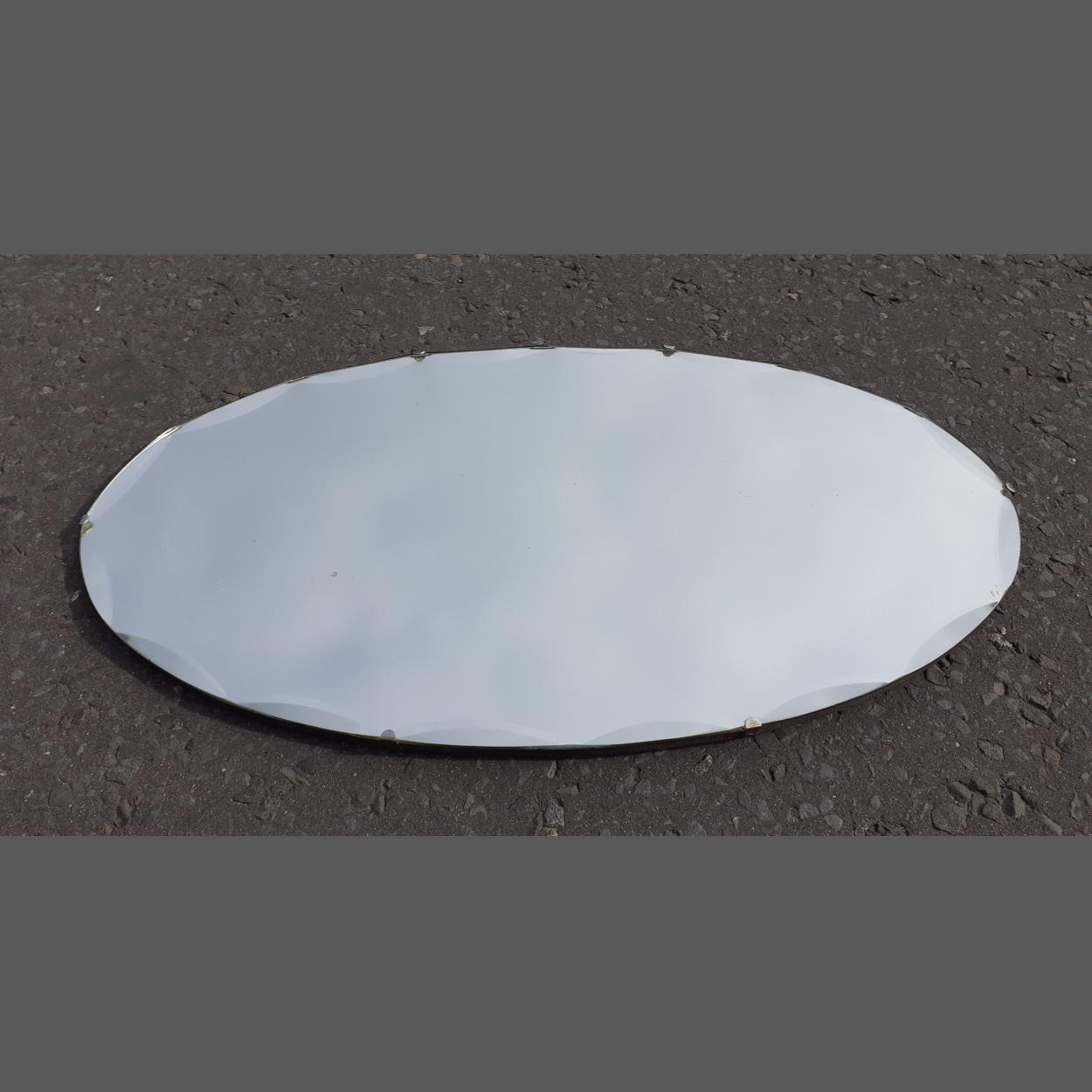 An antique oval mirror with cut angled edge/ approx 66cm tall x 39cm wide, with old chains.