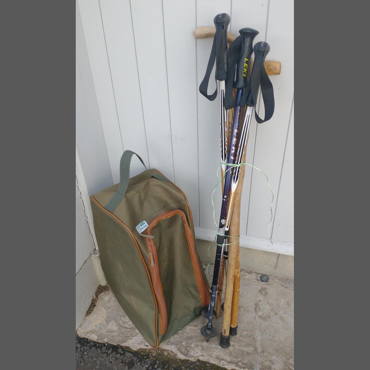 A CABOODLE Wellington Boot bag in good order and a quantity of six walking sticks and three walking poles in good useable condition.